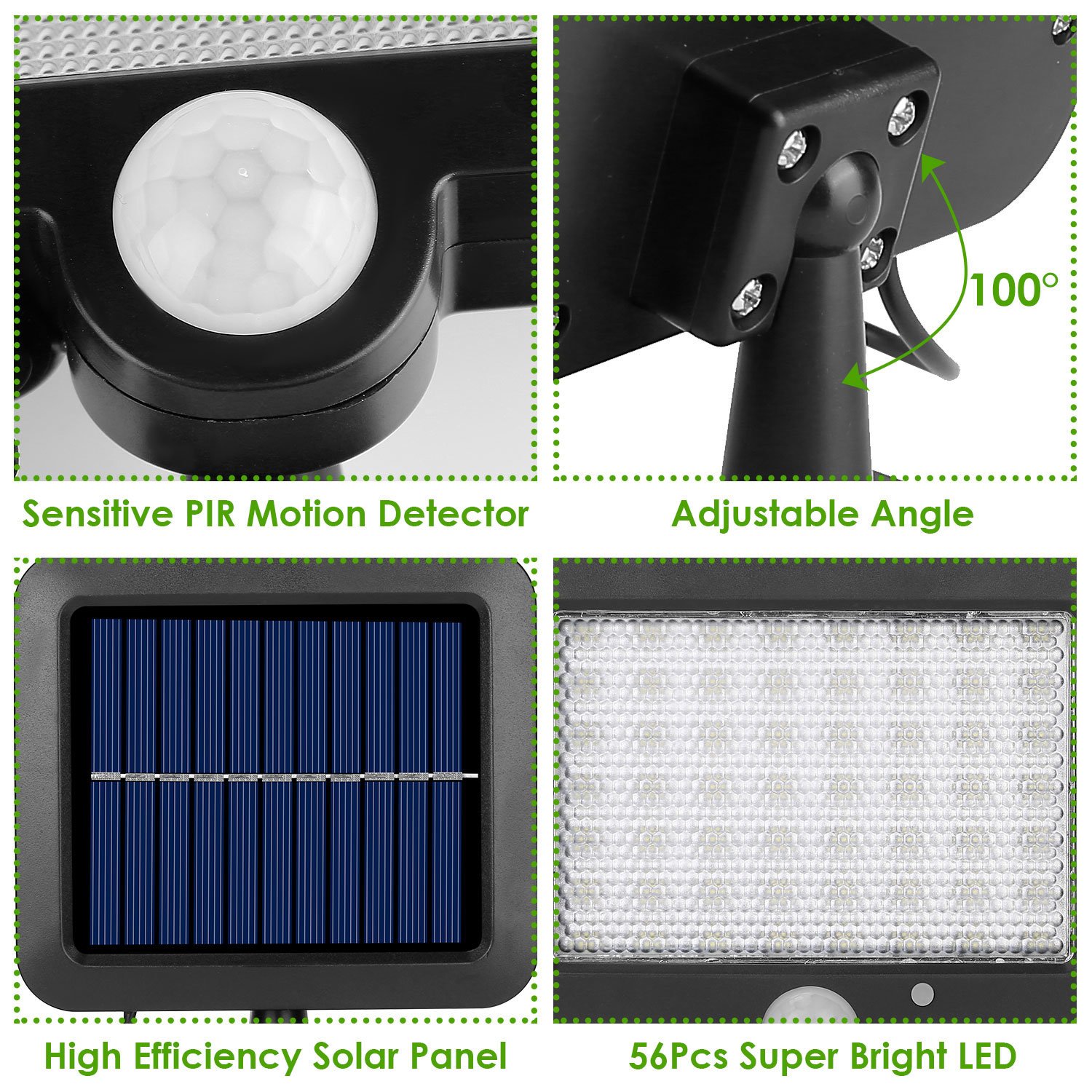 *3 Light Modes*:With 3 light modes for choice; you can freely switch the mode according to the situation. ① Motion Sensor Mode:The light turns on only when it detects movements.② Dimmable Sensor Control:The light will automatically turn on in dim mode at night and get brighter when it detects motion. ③ Always On Mode:The light turns on at night and stays medium lightness with or without detecting motion. With 56 LED light beads and 120 degree light angle; larger area can be covered and a safer and brighter environment be created for passers-by.