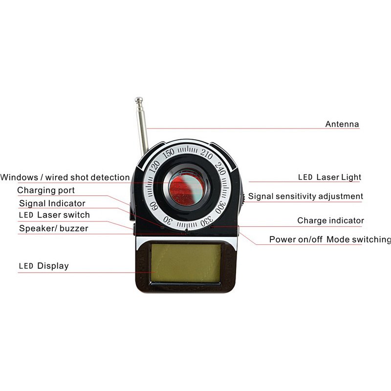 Easy to read backlit LCD display with battery; signal strength; and alert mode indicators | flashing LED lights and view Finder for detecting a variety of Camera lenses; both overt and covert