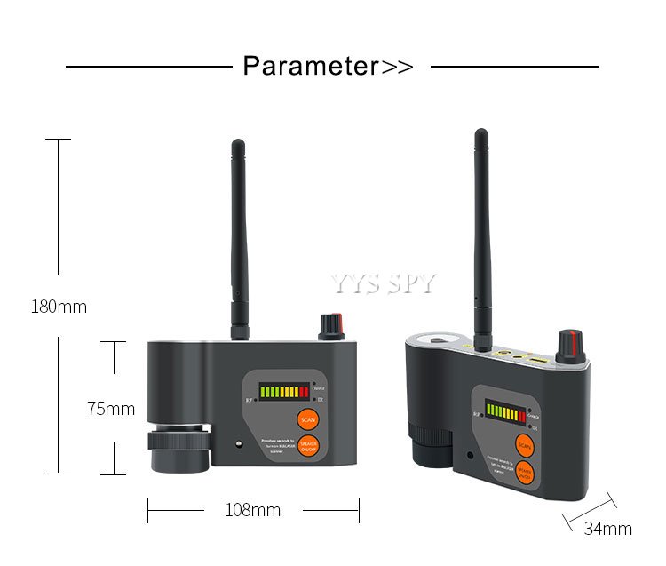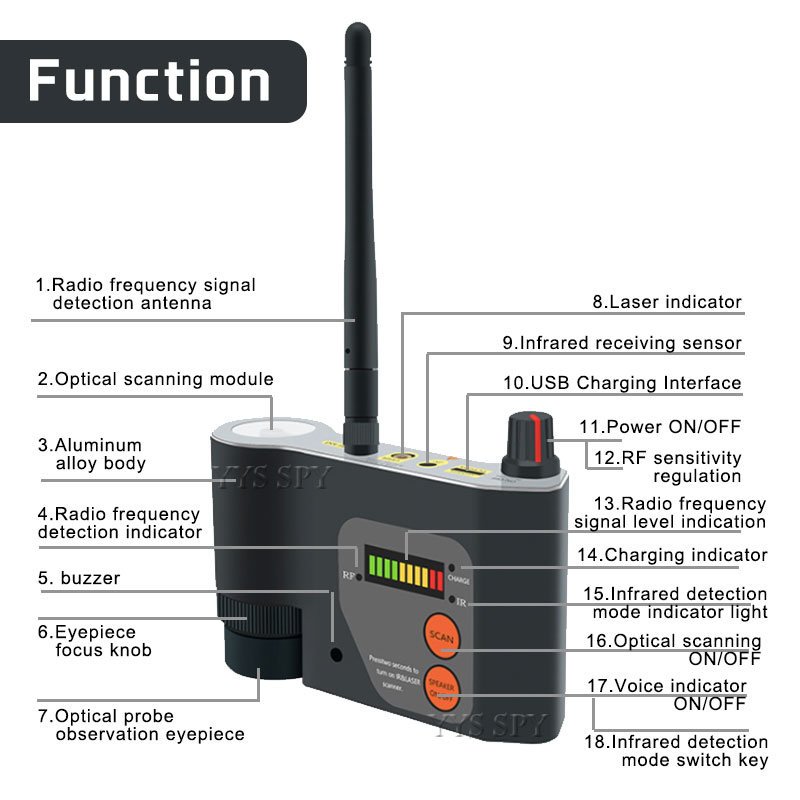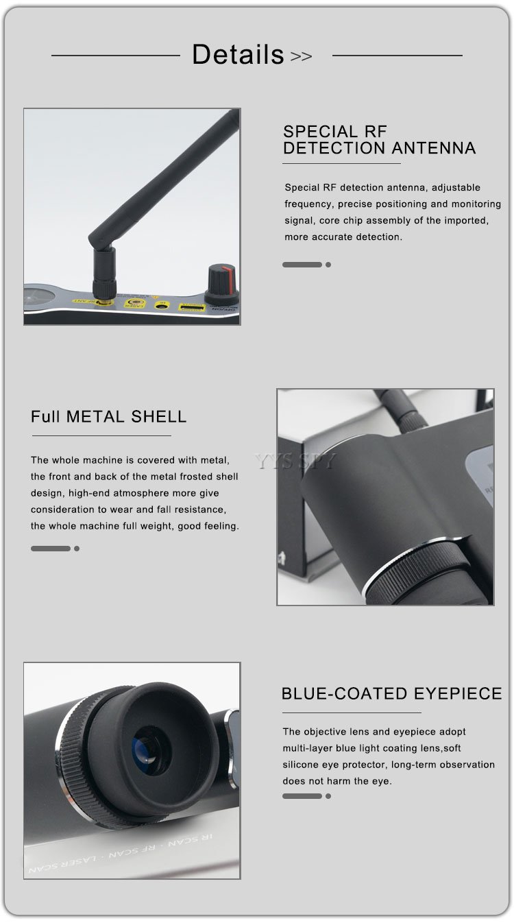 (2) This product integrates three detection methods in one; which can effectively detect the optical lens; emitted electromagnetic waves and infrared rays of pinhole cameras; bugs; locators and other equipment.