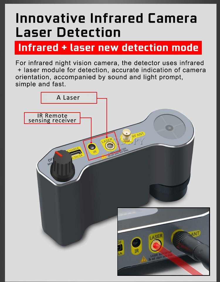 For infrared night vision camera; the detector uses infrared + laser module for detection; accurate indication of camera orientation; accompanied by sound and light prompt; simple and fast.
