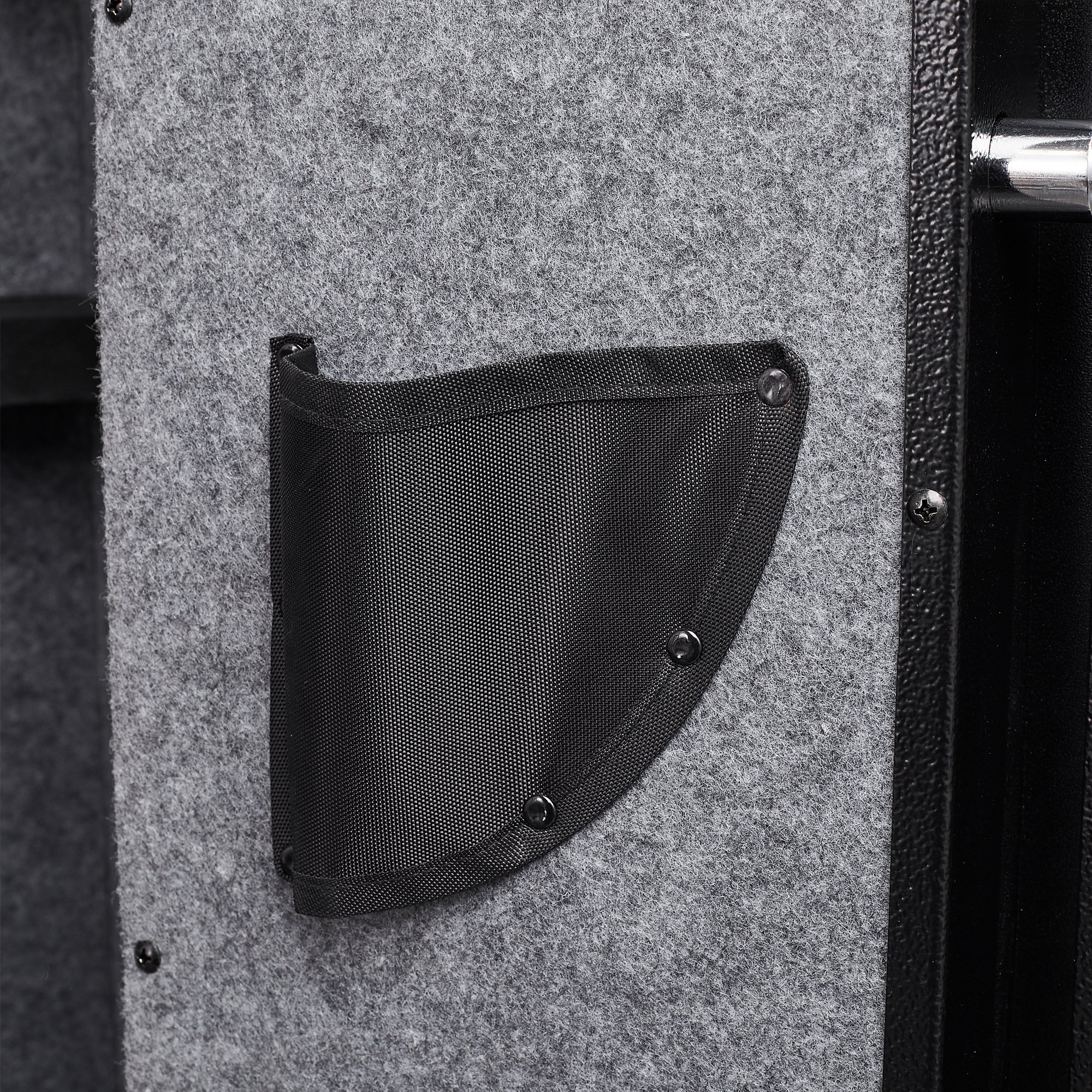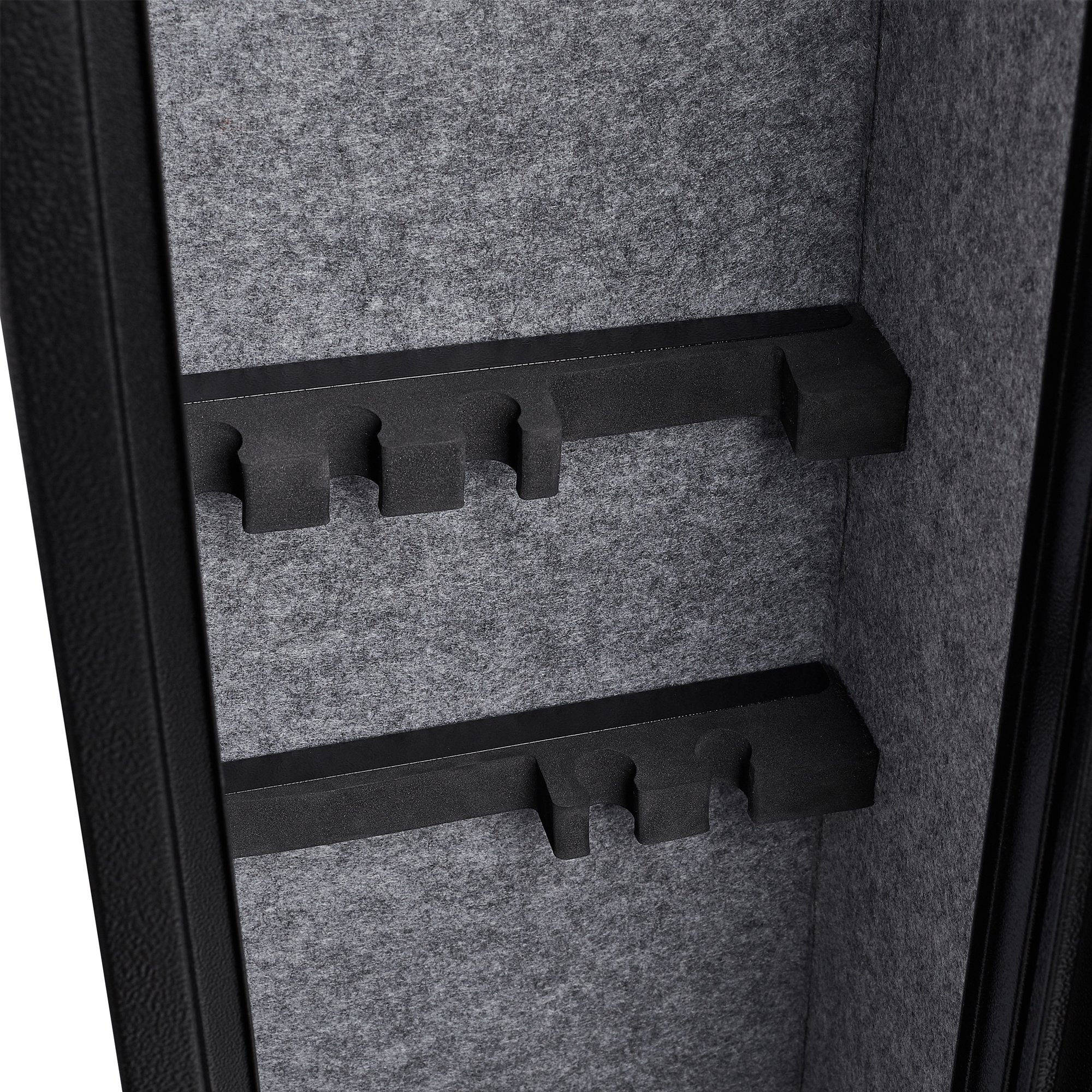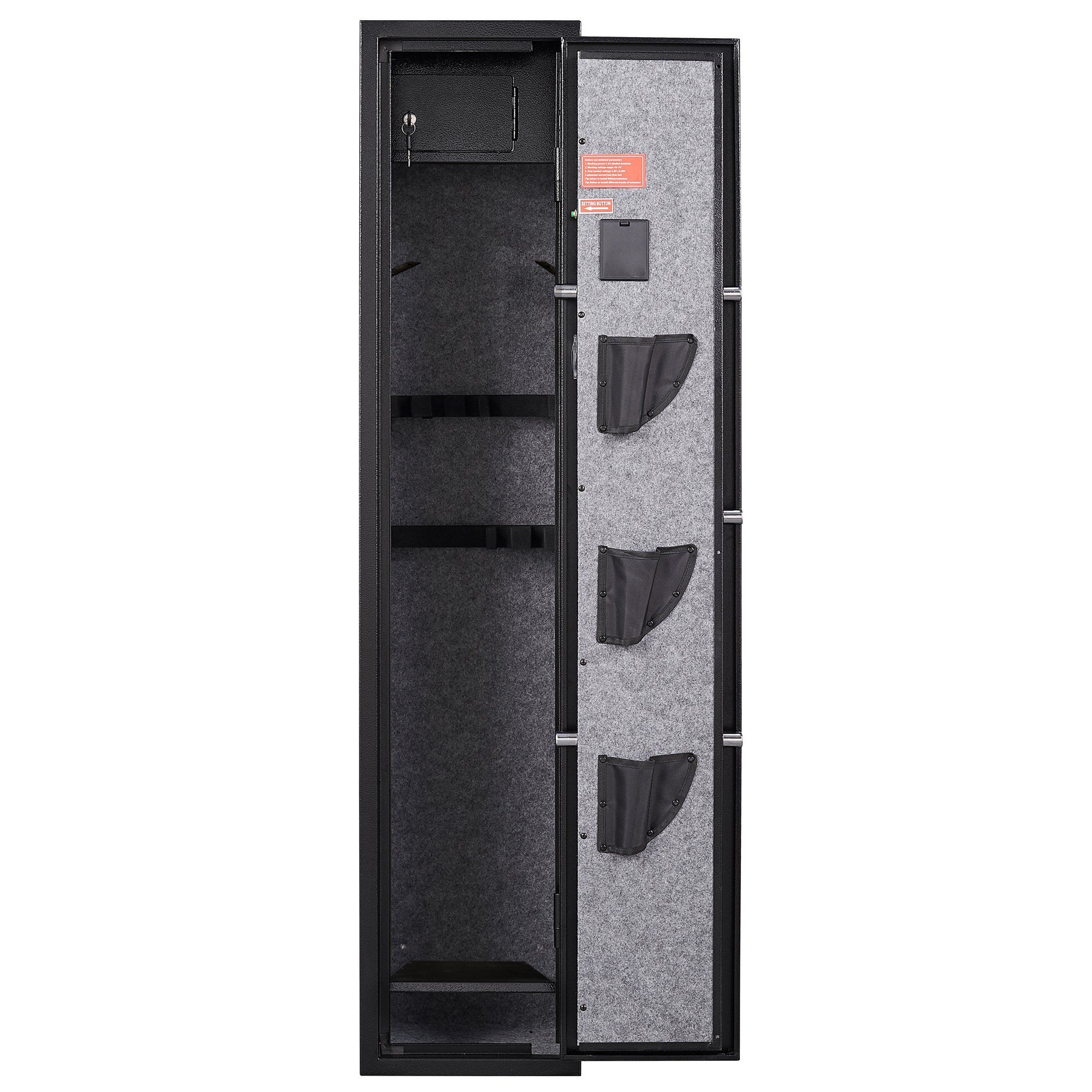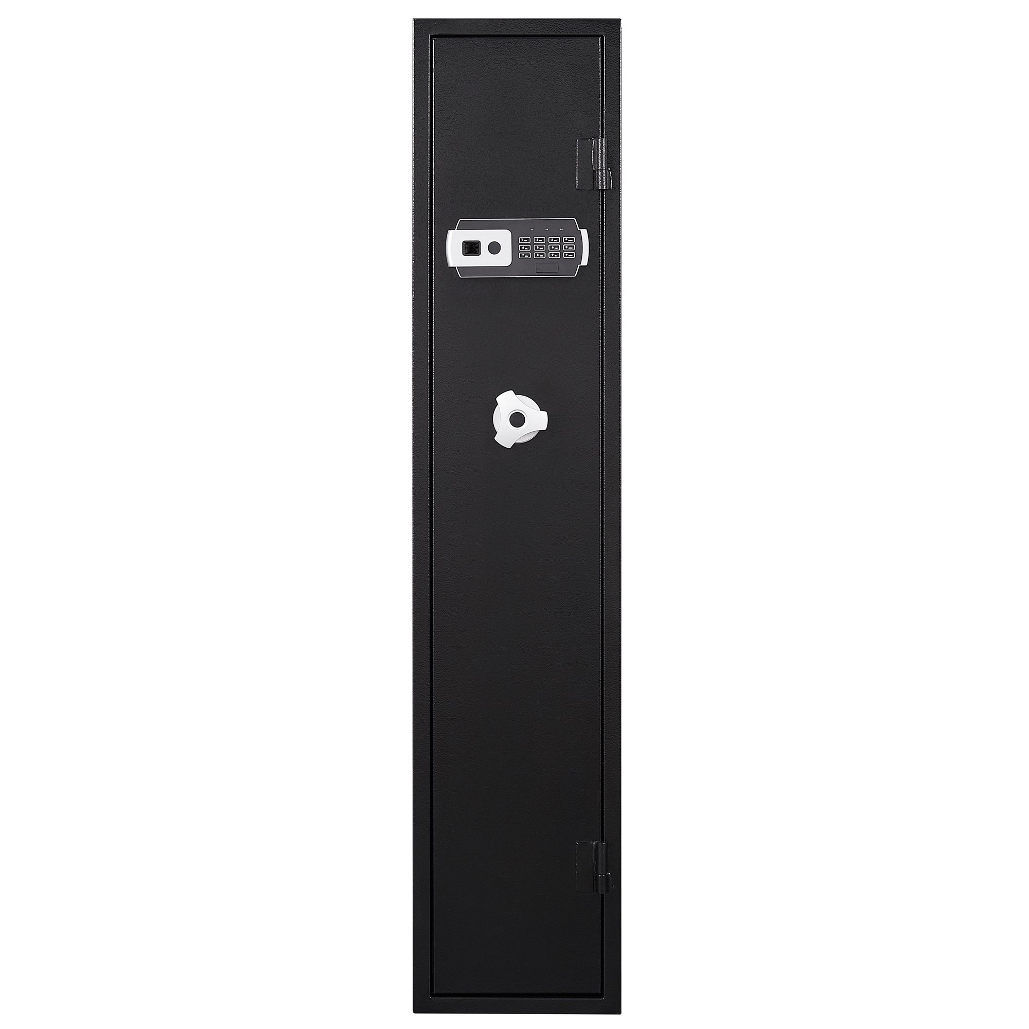 Product SpecificationsPackage contents: * 1 x Safe Cabinet* 1 x Instruction* 1 x External battery box* 2 x Backup Key* 2 x In-storage Key* 4 x Mounting Expansion BoltsDetails:[Quick access Digital gun safe] 1. Digital password+handle; 2. Emergency key+handle[LED light] The internal LED light will automatically lights up when use digital password to unlock the door. (LED light: Clear view in the dark)[In-storage box]Extra storage box provides more space to store stuffs such as bullets; jewerry and etc. It has individual key; increasing safety performance. (In-storage box: Much more space and double protection)[Removable shelf] The shelf can be moved easily; it provides more flexible space. (Removable shelf: More flexible space)[Gun holder&Pistol holster]These gun holders can be adjusted up and down; so it can be placed on suitable position which is according to the size of the rifles; More specific spaces to store pistols. (Gun holder &Pistol holster: Adjustable; suitable and stable)[Alarm system] For your security; violent vibration or three wrong password entries can activate the alarm system. (Alarm system: Safe and protective)[Silent mode]Turn to the silent function; increasing much more security. (Silent mode: Soundless and high security)