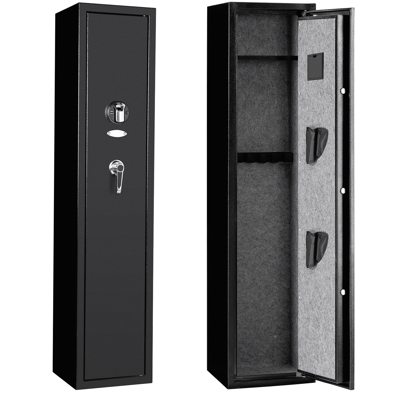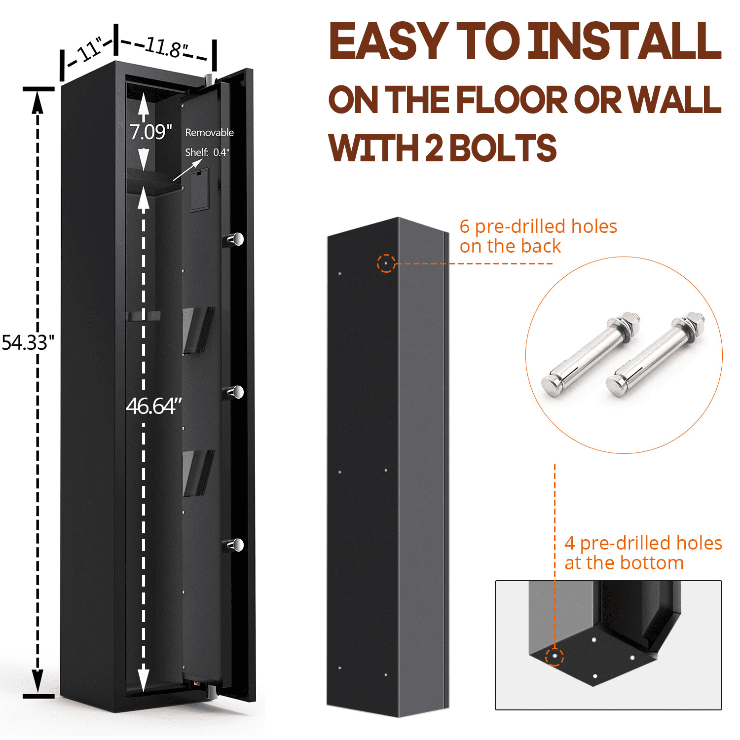 ✅Inter Dimension: H54.33' x W11.81' x L11.02'. ✅Diversified storage: The improved rifle safely stores up to 4 rifles and some pistols.✅Quick Access fingerprint Rifle Safe:With rapid reaction fingerprint lock system and can be easily quick setup and quick unlock.Keep your belongings safe.✅Bigger Deadbolts: With 7/8 inches thickness of 5 bigger steel locking bolts for home defense and security; preventing the children and others from breaking in.✅Easy Installation: With pre-drilled holes; this safe is easy to mount to the ground; in closets; garages; or any other location.✅Anti-static velvet design:The all-round anti-static velvet carpet design can suppress static electricity generated by static electricity; prevent fire and explosion caused by static electricity; and effectively prevent malfunction and damage of electronic equipment. A soft EVA holder inside protects your gun