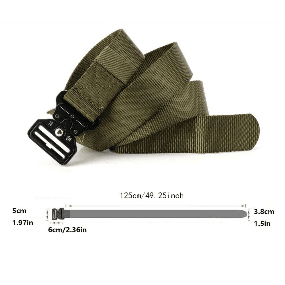 KT Deals Military Tactical Belt is not only Army fans' favorite; but also the outdoor sports and field training friends' good partnersand can the belt prior to a camping trip . This belt is the best choice for you Quick Release - The metal quick-release buckle makes fastening and releasing the belt extremely convenient and quick. No Holes - No holes on the belt; the tactical belt is full adjustable to a certain waist size. Heavy Duty - The tactical belt is with a metal alloy buckle; it can bear a large pulling force. Belt Size: Belt Width: 3.8cm / 1.5in Belt Length: 125cm / 49in in this tactical style belt comfortably fits up to a 43' waist.